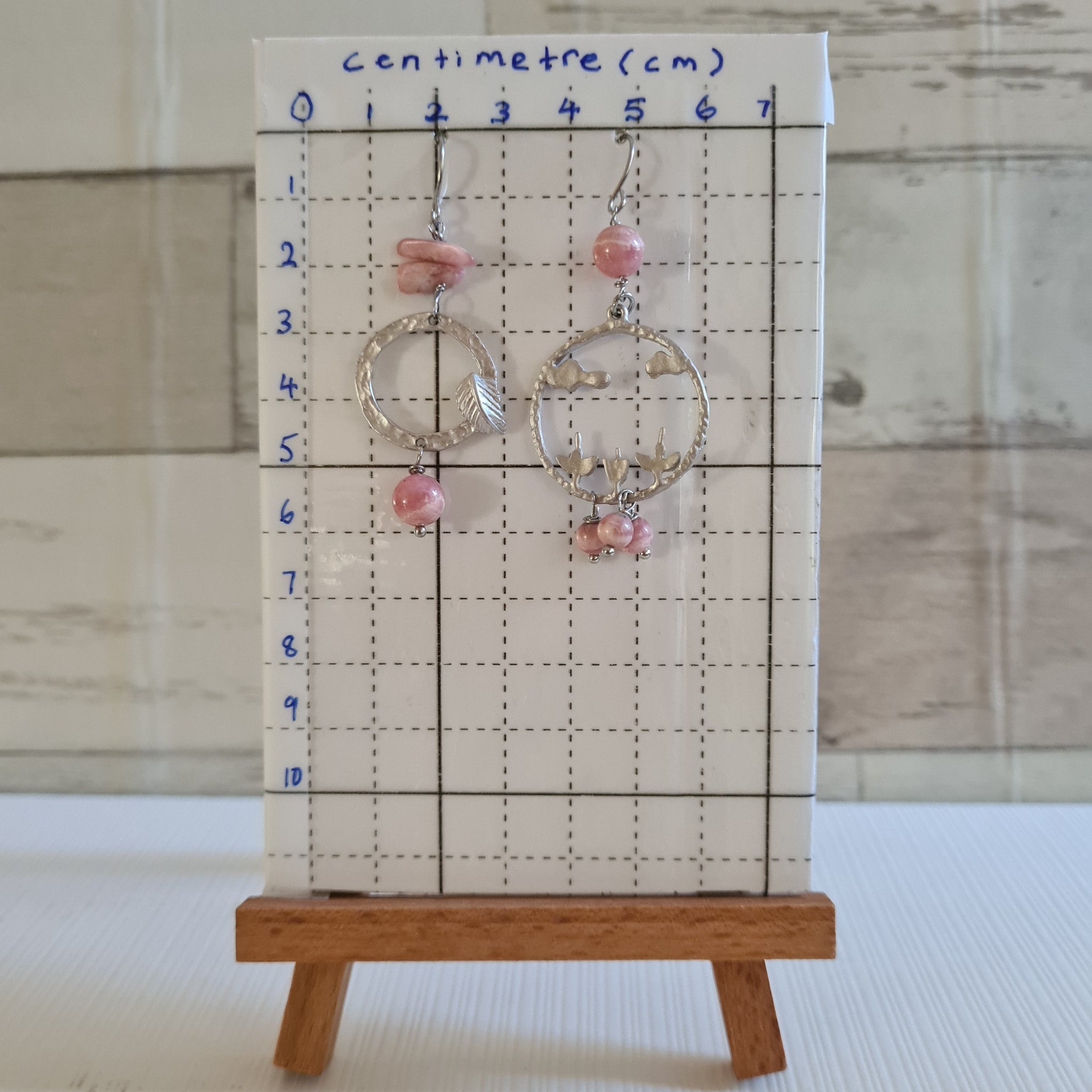 This pair of earrings consists of two earrings that are different in style, yet complement each other.